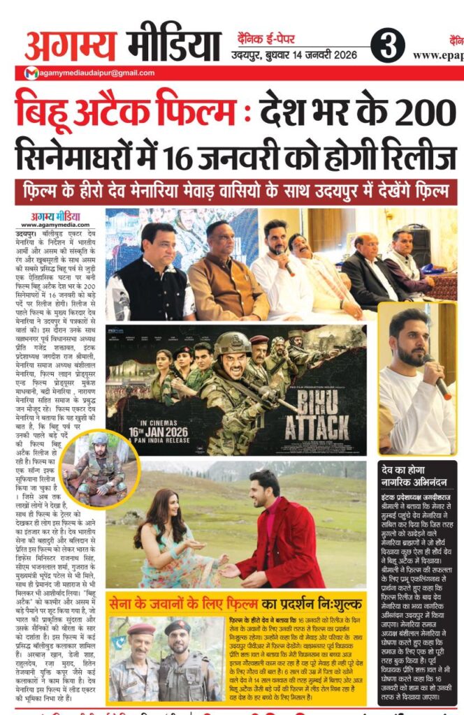 उदयपुर। बॉलीवुड एक्टर देव मेनारिया के निर्देशन में भारतीय आर्मी और असम की संस्कृति के रंग और खूबसूरती के साथ असम की सबसे प्रसिद्ध बिहू पर्व से जुड़ी एक ऐतिहासिक घटना पर बनी फिल्म बिहू अटैक देश भर के 200 सिनेमाघरों में 16 जनवरी को बड़े पर्दे पर रिलीज होगी। रिलीज से पहले फिल्म के मुख्य किरदार देव मेनारिया ने उदयपुर में पत्रकारों से वार्ता की। इस दौरान उनके साथ वल्लभनगर पूर्व विधानसभा अध्यक्ष प्रीति गजेंद्र शक्तावत, इंटक प्रदेशाध्यक्ष जगदीश राज श्रीमाली, मेनारिया समाज अध्यक्ष बंशीलाल मेनारिया, फ़िल्म लाइन प्रोड्यूसर एन्ड फ़िल्म प्रोड्यूसर मुकेश माधवानी, बद्री मेनारिया , नारायण मेनारिया सहित समाज के प्रबुद्ध जन मौजूद रहे।