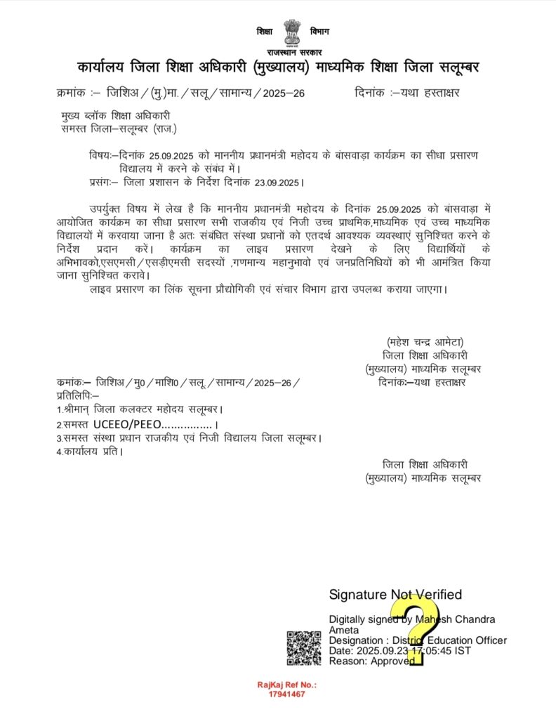 प्रधानमंत्री मोदी का बांसवाड़ा कार्यक्रम जिले के सभी राजकीय और निजी विद्यालयों में सीधा प्रसारित किया जाएगा। जिला शिक्षा अधिकारी (मुख्यालय) माध्यमिक शिक्षा, सलूंबर ने इसके लिए आदेश जारी किए हैं। आदेशानुसार 25 सितंबर को सभी प्राथमिक, उच्च प्राथमिक और माध्यमिक विद्यालयों में आवश्यक व्यवस्थाएं सुनिश्चित करनी होंगी।